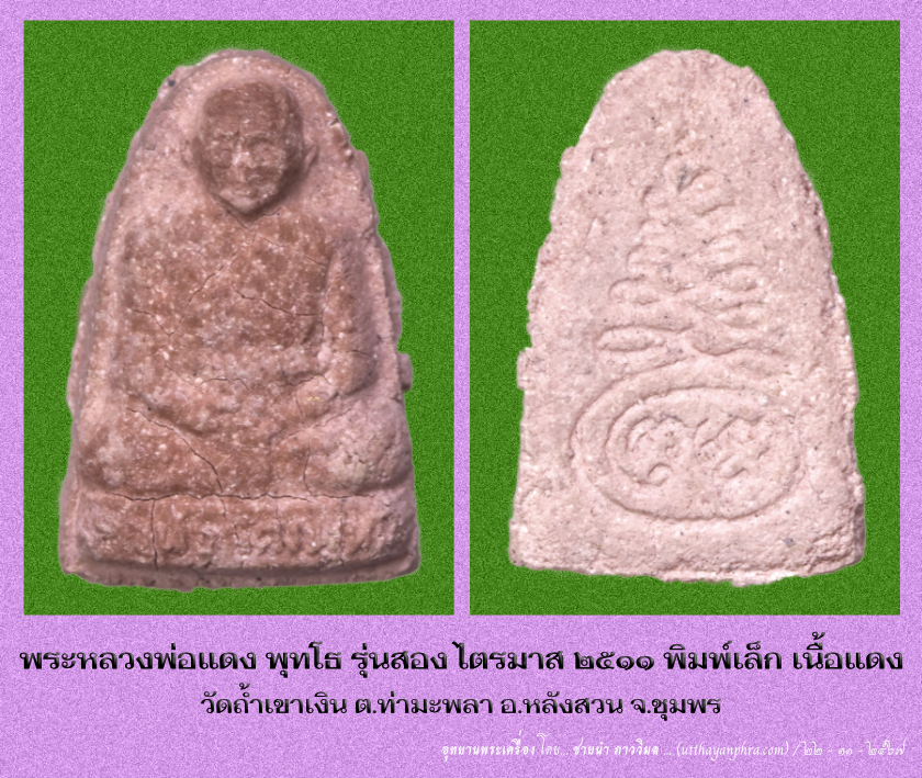 ๖.๒ พระผงรูปเหมือนหลวงพ่อแดง พุทโธ พิมพ์เล็ก ลักษณะคล้ายพระหลวงพ่อแดง พุทโธ เนื้อสัมฤทธิ์ ด้านหลังประทับด้วยยันต์พุทโธในลักษณะยันต์จม องค์พระกว้างประมาณ ๑.๘ เซนติเมตร สูงประมาณ ๒.๕ เซนติเมตร