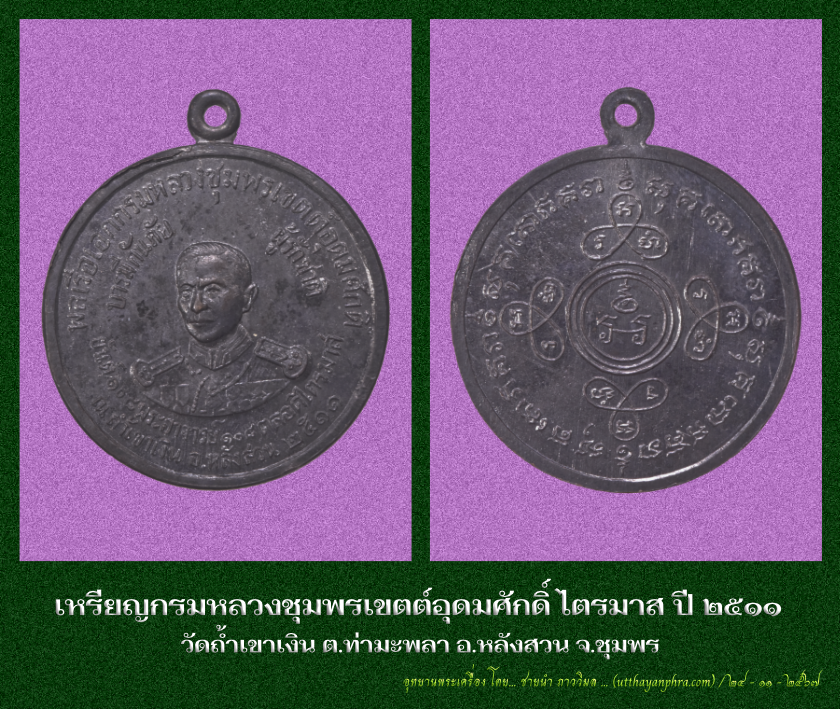 ลักษณะ ด้านหน้าเป็นพระรูปกรมหลวงชุมพรเขตต์อุดมศักดิ์ในฉลองพระองค์นายพลเรือแบบครึ่งองค์ ด้านบนของพระรูป ฯ เป็นอักษร ๒ แถว แถวบนสุดจารึกนาม "พลเรือเอกกรมหลวงชุมพรเขตต์อุดมศักดิ์" ถัดลงมาทางขวาของเหรียญจารึกบารมีกันภัย ด้านซ้ายของเหรียญผู้รักชาติ ด้านล่าง อักษรแถวในจารึกยันต์ ๑๐๘ พระอาจารย์ ๑๐๘ ตลอดไตรมาส และอักษรแถวล่างสุด ณ ถ้ำเขาเงิน อ.หลังสวน ๒๕๑๑ ด้านหลังประทับด้วยยันต์สามชุด ตรงกลางเป็นวงกลมสามวง ในวงกลมเป็นตัว อะ กับ อุณาโลม ล้อมด้วยยันต์ใบพัดจารึกพระคาถา อรหัง ทั้งสี่ด้าน อักขระขอมรอบนอกเป็นพระคาถา สุคโต ภควา