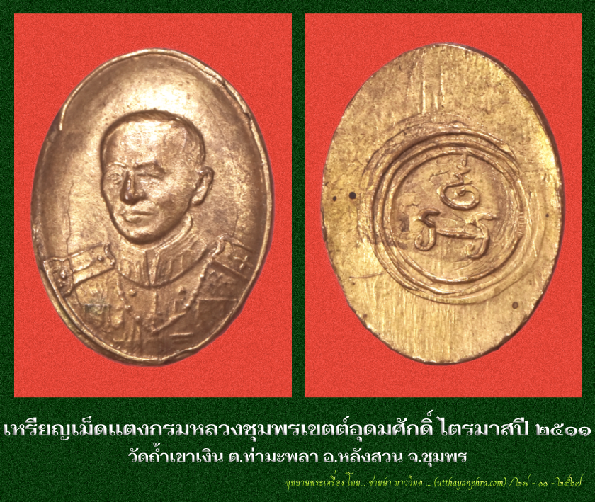 ลักษณะ เป็นเหรียญรูปไข่ขนาดเล็กที่เรียกกันว่า"เหรียญเม็ดแตง" ด้านหน้าเป็นรูปกรมหลวงชุมพรเขตต์อุดมศักดิ์ในฉลองพระองค์แบบนายพลเรือ ด้านหลังประทับด้วยอักขระขอม อะ และ อุณาโลม ในวงกลมสองวง