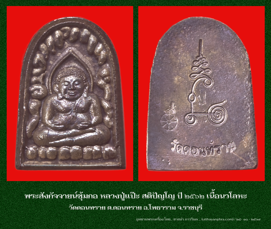 พระสังกัจจายน์ซุ้มกอ หลวงปู่แป๊ะ สติปญฺโญ ปี ๒๕๖๒ จัดเป็นพระเครื่องและวัตถุมงคลรุ่น ๔ (รุ่นสุดท้าย) ที่คณะศิษย์กลุ่มเพจท่าจีนดอทคอมและคณะศิษย์หลวงปู่ดี สุวณฺโณ วัดสุวรรณาราม จำนวน ๑๑ คนร่วมกันสร้างถวายพระครูวิมลปัญญานุกูล (แป๊ะ สติปญฺโญ) เพื่อมอบให้เป็นที่ระลึกกับผู้มีจิตศรัทธาที่มาทำบุญร่วมกับวัดดอนทรายตามที่หลวงปู่แป๊ะ สติปญฺโญ เห็นสมควร พระเครื่องที่สร้างในวาระนี้ มี ๔ รายการ ได้แก่ พระสังกัจจายน์ซุ้มกอเนื้อผงผสมไม้แก่นจันทน์, พระสังกัจจายน์ซุ้มกอเนื้อโลหะ, พระผงรูปเหมือนรุ่นแรก และล็อกเก็ต รุ่นสอง