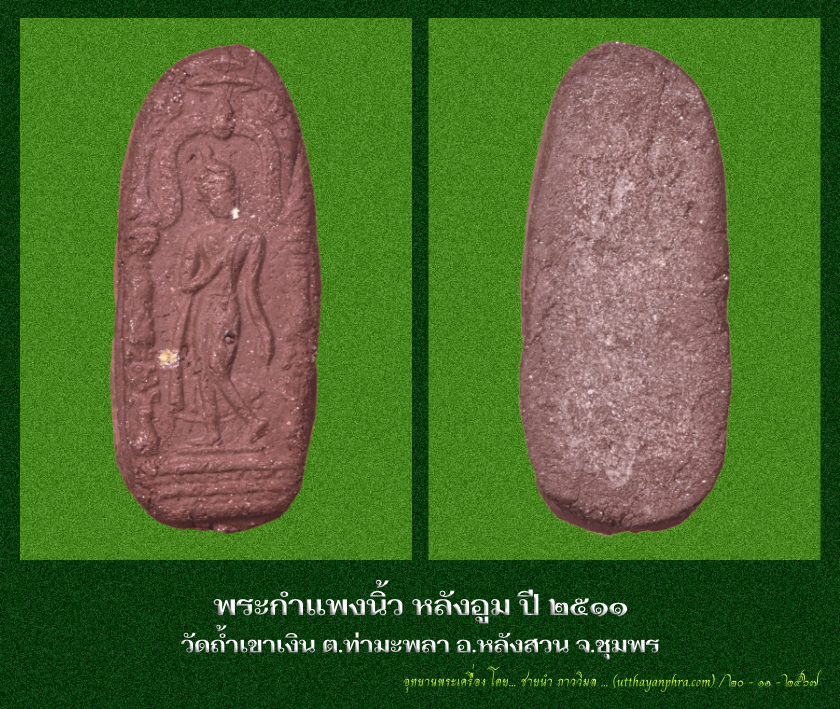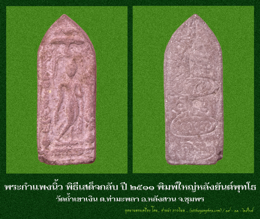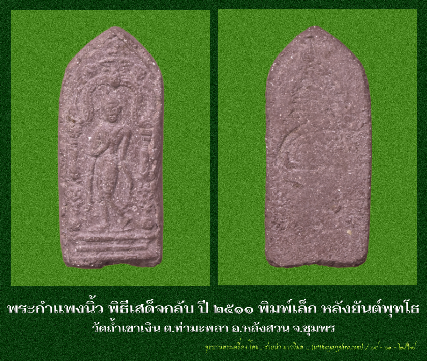๑) พระกำแพงนิ้วหลังยันต์พุทโธ พระกำแพงนิ้วหลังยันต์พุทโธเป็นพระวัดถ้ำเขาเงินโดยไม่มีข้อกังขา และไม่จำเป็นต้องหยิบยกเหตุผลใดมาสนับสนุน เพราะยันต์หลังเป็นเกณฑ์การพิจารณาที่ชัดเจน เนื้อหาก็ละเอียดและแห้งกว่าพระกำแพงนิ้วในกลุ่มที่สองที่จะนำเสนอในลำดับต่อไป เท่าที่พบเห็นและมีไว้ในครอบครอง พระกำแพงนิ้วในกลุ่มนี้มี ๒ พิมพ์ คือ พิมพ์ใหญ่ องค์พระยกพระหัตถ์ซ้ายและลีลาเยื้องไปทางด้านซ้าย ขนาดกว้างประมาณ ๑.๘ เซนติเมตร และสูงประมาณ ๔.๗ เซนติเมตร พิมพ์เล็ก องค์พระยกพระหัตถ์ขวาและลีลาเยื้องไปทางด้านขวา ขนาดกว้างประมาณ ๑.๗ เซนติเมตร และสูงประมาณ ๔.๒ เซนติเมตร บางองค์มีการทาทองด้านหน้า