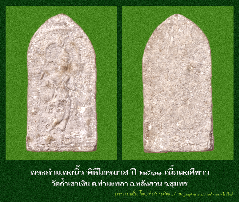 ๔) พระกำแพงนิ้วหลังเรียบเนื้อผงพุทธคุณ พระกำแพงนิ้วหลังเรียบเนื้อผงพุทธคุณชุดนี้ มีขนาดเล็กกว่าพระกำแพงนิ้วทั้ง ๓ กลุ่มข้างต้น คือ ขนาดประมาณ ๑.๕ เซนติเมตร สูงประมาณ ๒.๙ ๓.๐ เซนติเมตร พระเนื้อผงพุทธคุณนี้ ไม่ปรากฏพบเห็นในพิธีเสด็จกลับวัดถ้ำเขาเงิน เดือนกุมภาพันธ์ - มีนาคม ส่วนพิธีใหญ่ที่วัดบ้านสวน คงต้องตรวจสอบข้อมูลเพิ่มเติมเพราะพระปิดตานอโมของวัดบ้านสวนมีพระปิดตานอโมพิมพ์สองหน้าเนื้อผงพุทธคุณและเนื้อโลหะจำนวนหนึ่ง พระเนื้อผงพุทธคุณและเนื้อโลหะที่หลวงพ่อคง สิริมโต วัดบ้านสวน พ่อท่านคล้อย ฐานธมฺโม และอาจารย์ชุม ไชยคีรี ร่วมกันจัดสร้างในปี ๒๕๑๑ ส่วนใหญ่ปรากฏอยู่ในพิธีไตรมาส ข้อสรุปเบื้องต้นคงต้องให้น้ำหนักว่าเป็นพระกำแพงนิ้วที่สร้างในพรรษาปี ๒๕๑๑ ที่วัดถ้ำเขาเงิน