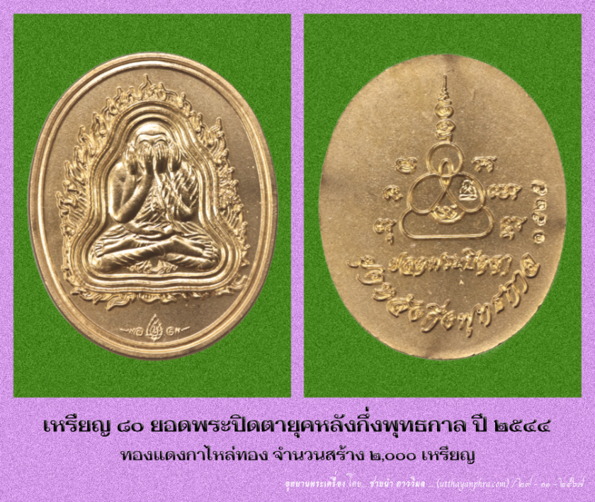 ลักษณะ เป็นเหรียญรูปไข่ขนาด ด้านหน้าเป็นภาพพระปิดตาในลักษณะเดียวกับหน้าปกหนังสือ ๘๐ ยอดพระปิดตาหลังกึ่งพุทธกาล ใต้ภาพเป็นสัญลักษณ์ดอกบัวตูม ๙ กลีบซึ่งดัดแปลงมาจาก ยันต์บัวแก้วนวหรคุณ ตรงกลางดอกบัวเป็นอุณาโลม ขนาบข้างดอกบัวด้วยอุณาโลม ด้านหลังประทับด้วยยันต์พระภควัมปติ ตามรูปยันต์ที่จัดวางในปกหลังหนังสือ ๘๐ ยอพระปิดตายุคหลังกึ่งพุทธกาล