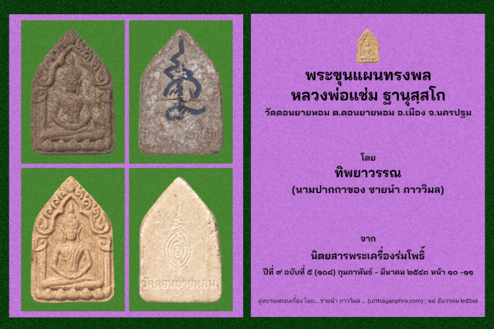 (บทความเก่าที่ตีพิมพ์ในนิตยสารพระเครื่องร่มโพธิ์ ปีที่ ๙ ฉบับที่ ๕ (๑๐๘) กุมภาพันธ์ - มีนาคม ๒๕๔๓ หน้า ๑๐ - ๑๑ โดยใช้นามปากกาว่า "ทิพยาวรรณ"