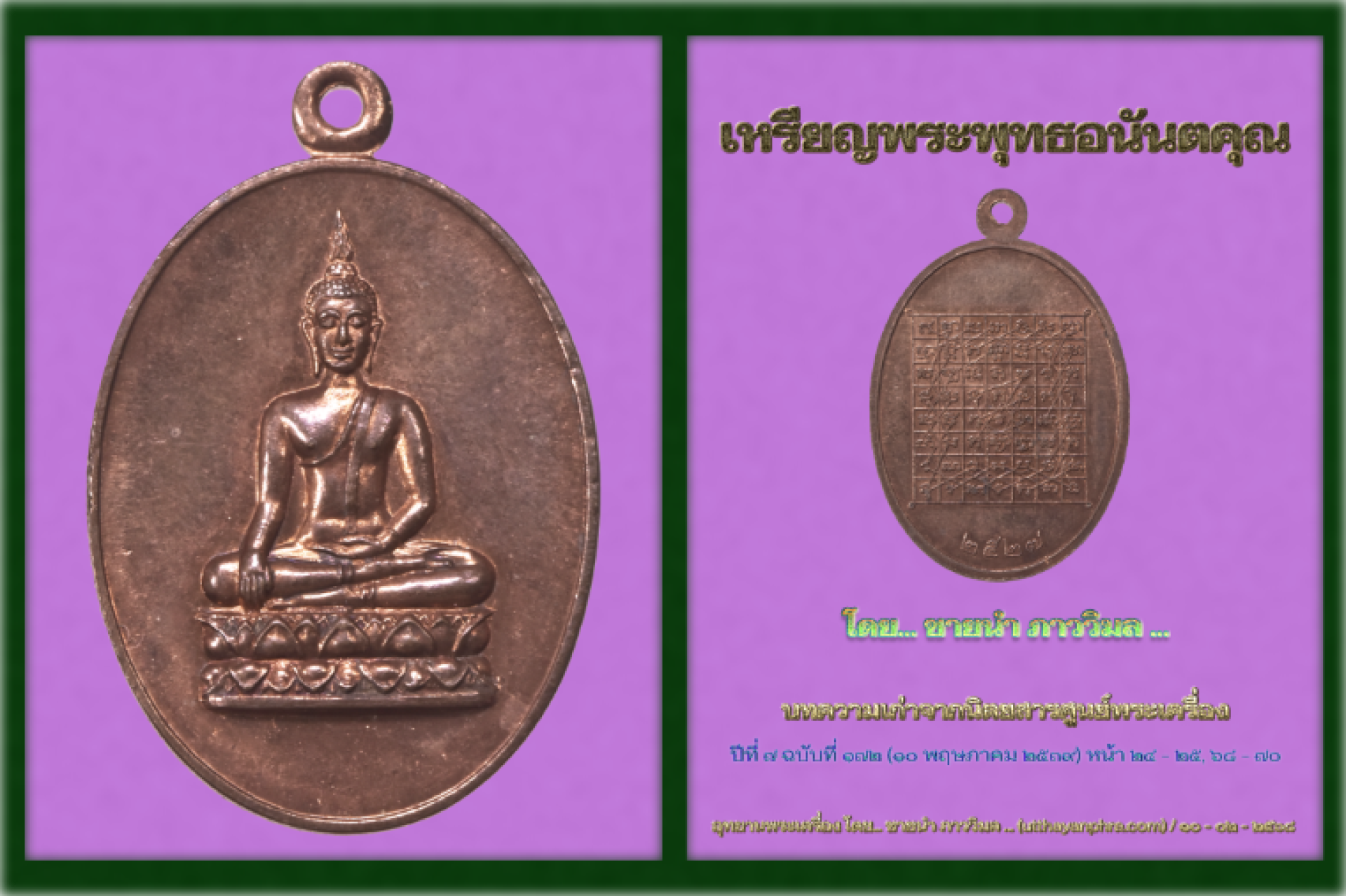 การนำเสนอเรื่องเหรียญพระพุทธในฉบับนี้ (ศูนย์พระเครื่อง ปีที่ ๗ ฉบับที่ ๑๗๒ / ๑๐ พฤษภาคม ๒๕๓๙) ผู้เขียนจะได้หยิบยกเหรียญดี มีศิลปะที่ทรงคุณค่าอย่างยิ่งอีกเหรียญหนึ่งที่ไม่ค่อยมีคนรู้จักมากนัก มาเสนอต่อท่านผู้อ่านโดยละเอียดเพื่อให้เห็นถึงศรัทธาและความมุ่งมั่นของพุทธศาสนิกชนท่านหนึ่งที่ต้องการสร้างพระเครื่องที่ทรงคุณค่า มีพุทธคุณยอดเยี่ยมตามแบบฉบับของการสร้างพระเครื่องที่มีมาแต่โบราณกาล ผลที่เกิดขึ้นจากศรัทธาและความมุ่งมั่นนี้ ถ้าจะหยิบยกหรือนำเรื่องอภินิหาร ประสบการณ์ต่าง ๆ ที่เกิดขึ้นมาเล่าสู่กันฟัง อาจเกิดวิจิกิจฉาหรือข้อสงสัยต่าง ๆ นานัปการ ถ้าเชื่อก็ดีไป ถ้าไม่เชื่อ เรื่องราวที่หยิบยกมาก็จะมีค่าเป็นเพียงนิยายปรัมปรา หรือไม่ก็นิทานหลอกเด็กเท่านั้น ดังนั้น สาระสำคัญของบทความนี้ จึงอยู่ที่กระบวนการจัดสร้างที่พิถีพิถันในทุก ๆ ขั้นตอน เริ่มจากการออกแบบ เนื้อหามวลสารที่มีส่วนผสมของชนวนต่าง ๆ มากมาย และท้ายสุดคือ "พิธีกรรม"