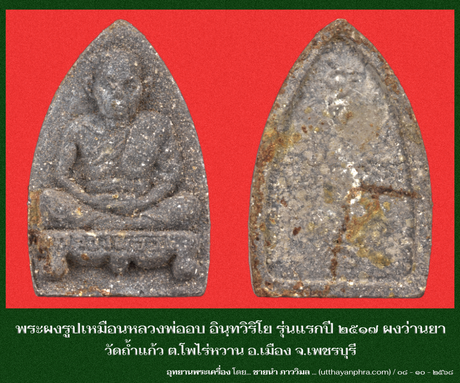 พระผงรูปเหมือนหลวงพ่ออบ อินฺทวิริโย วัดถ้ำแก้ว รุ่นแรกพิมพ์หลังเตารีด เป็นอีกหนึ่งในพระเนื้อผงว่านนี้ที่ควรค่าแก่การสะสมเชิงอนุรักษ์เป็นอย่างยิ่ง ด้วยเหตุที่ว่ามีประวัติความเป็นมา พื้นที่รับรู้และเล่นหากันมานานแล้ว
